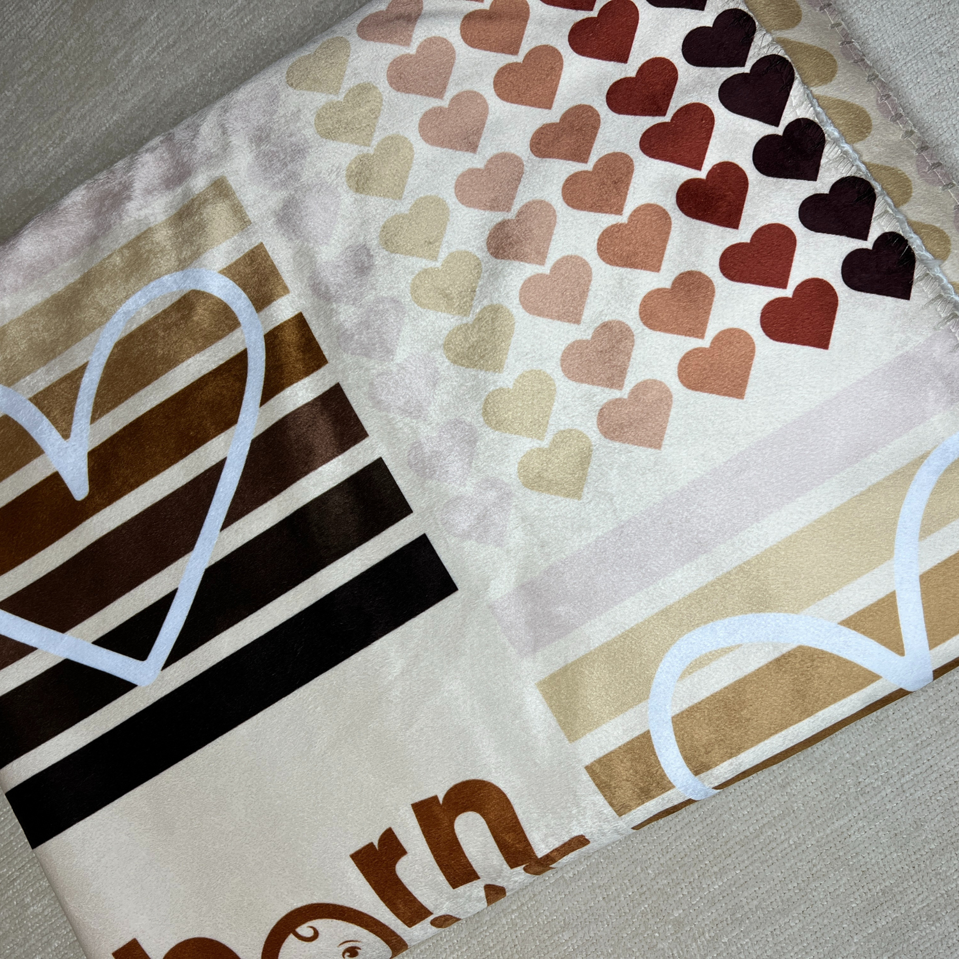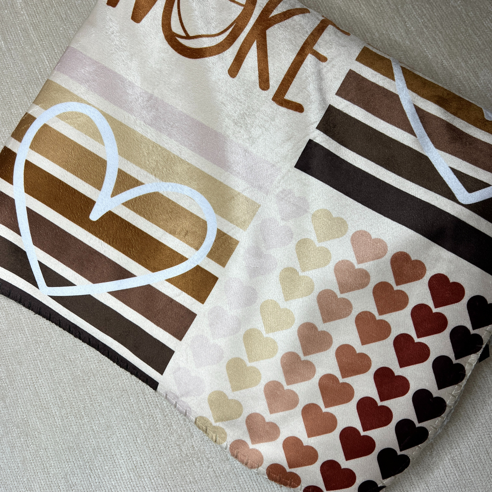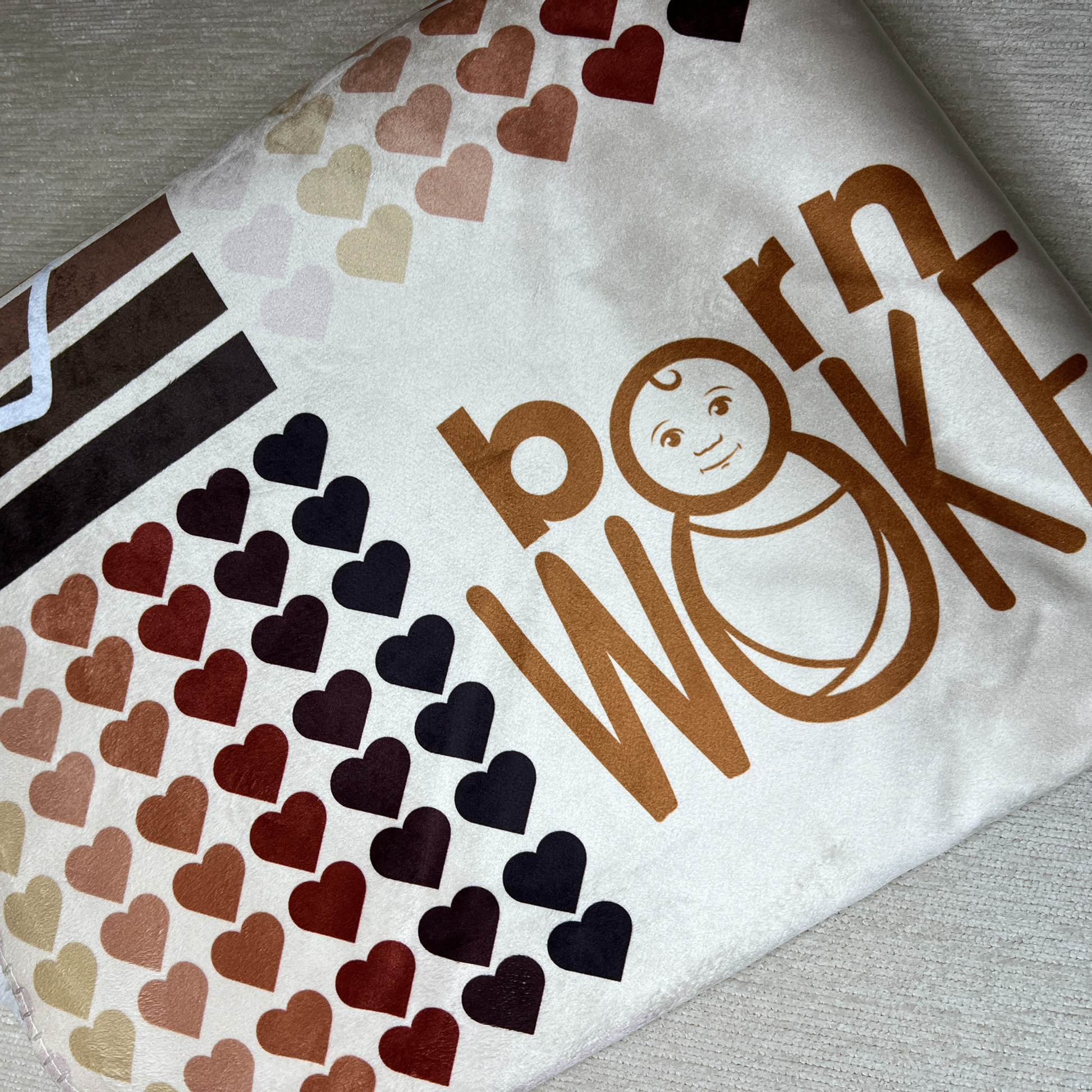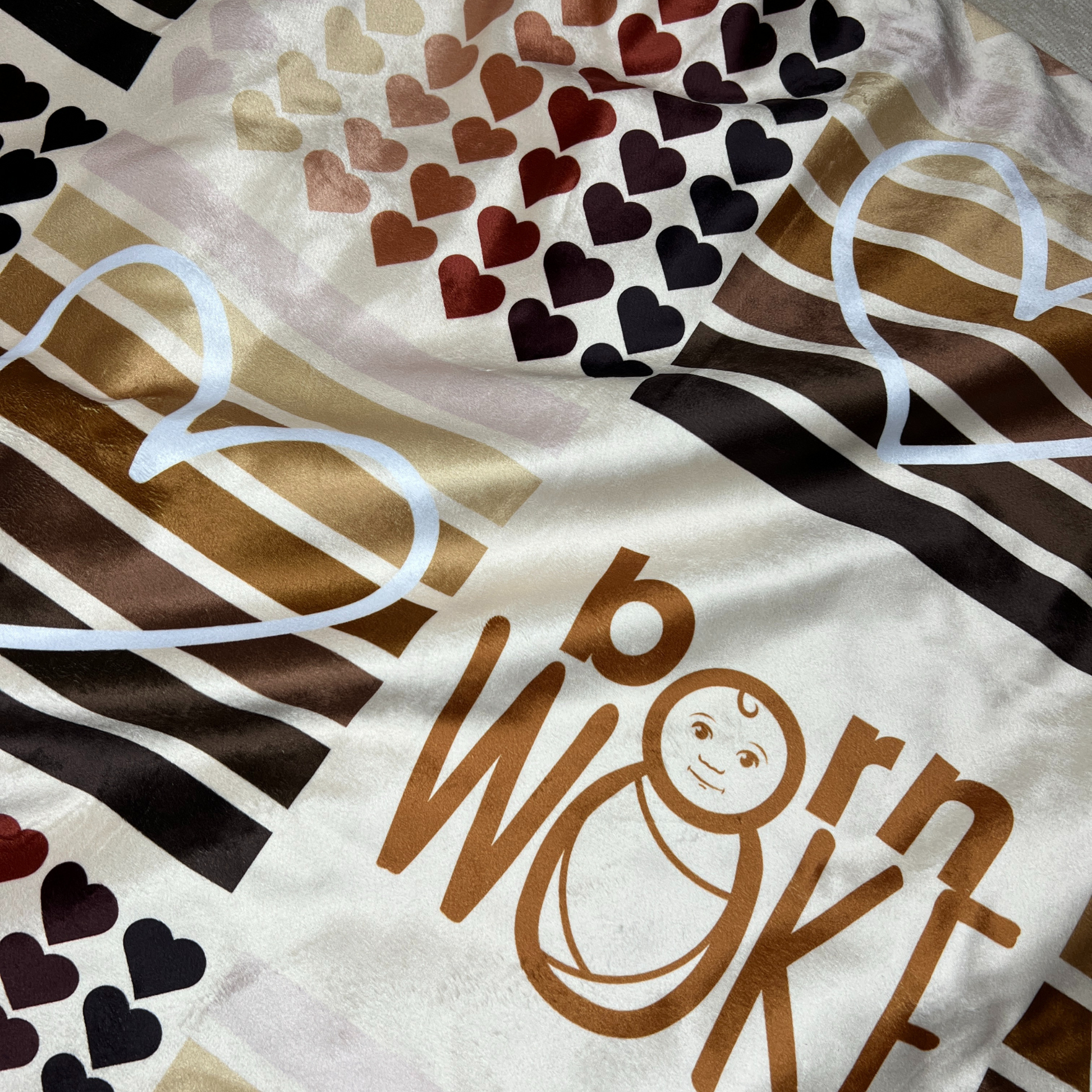 Introducing the Melanin Love Blanket from our new Melanin Collection, a celebration of love and diversity through the beauty of various shades of brown. This modern quilt-patterned design features hearts in rich melanin tones, accented by our signature Born Woke logo. Set against a warm tan background, the hearts beautifully stand out, symbolizing unity and pride.